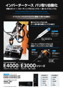 ロボットハンドにスピンドルを2本搭載(高トルクスピンドル/フローティングスピンドル)することで、ダイキャスト鋳造インバーターケースのバリ取り自動化を実現。
