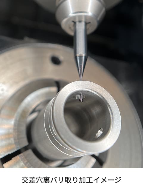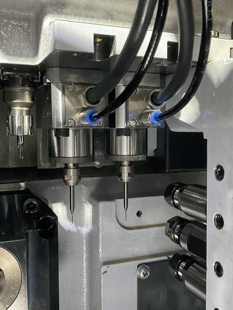 標準回転工具(GSC1310)での粗切削後、ナカニシ高速モータスピンドル(BMF-3160-CTZ)で仕上げ切削を実施。Cincomの標準回転工具や増速スピンドルを電動化する事により最高回転速度60,000min⁻¹が可能に。標準回転工具との切削比較では送り速度10倍を実現。